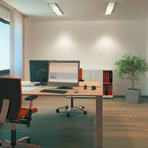 Večina pisarniških delovnih prostorov je osvetljena s svetilkami, ki so bodisi vgrajene v spuščene stropove (vgradna svetila), ali pritrjene direktno na betonski strop (nadgradna svetila).